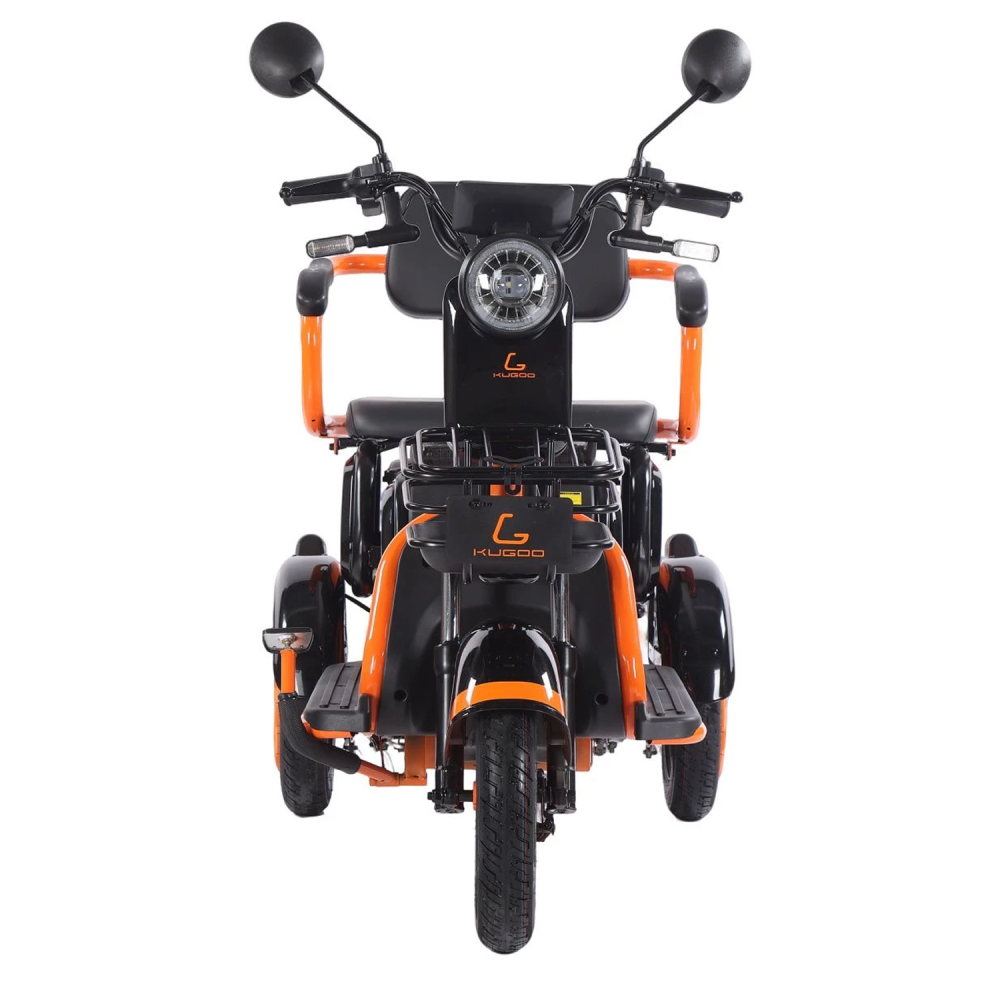Kugoo T1 — это компактный трёхколёсный электровелосипед с прочной алюминиевой рамой, задним приводом и мотором мощностью 500 Вт. Оснащён литий-ионным аккумулятором 48 V / 20.8 Ah, 3-ступенчатой трансмиссией и барабанными тормозами.