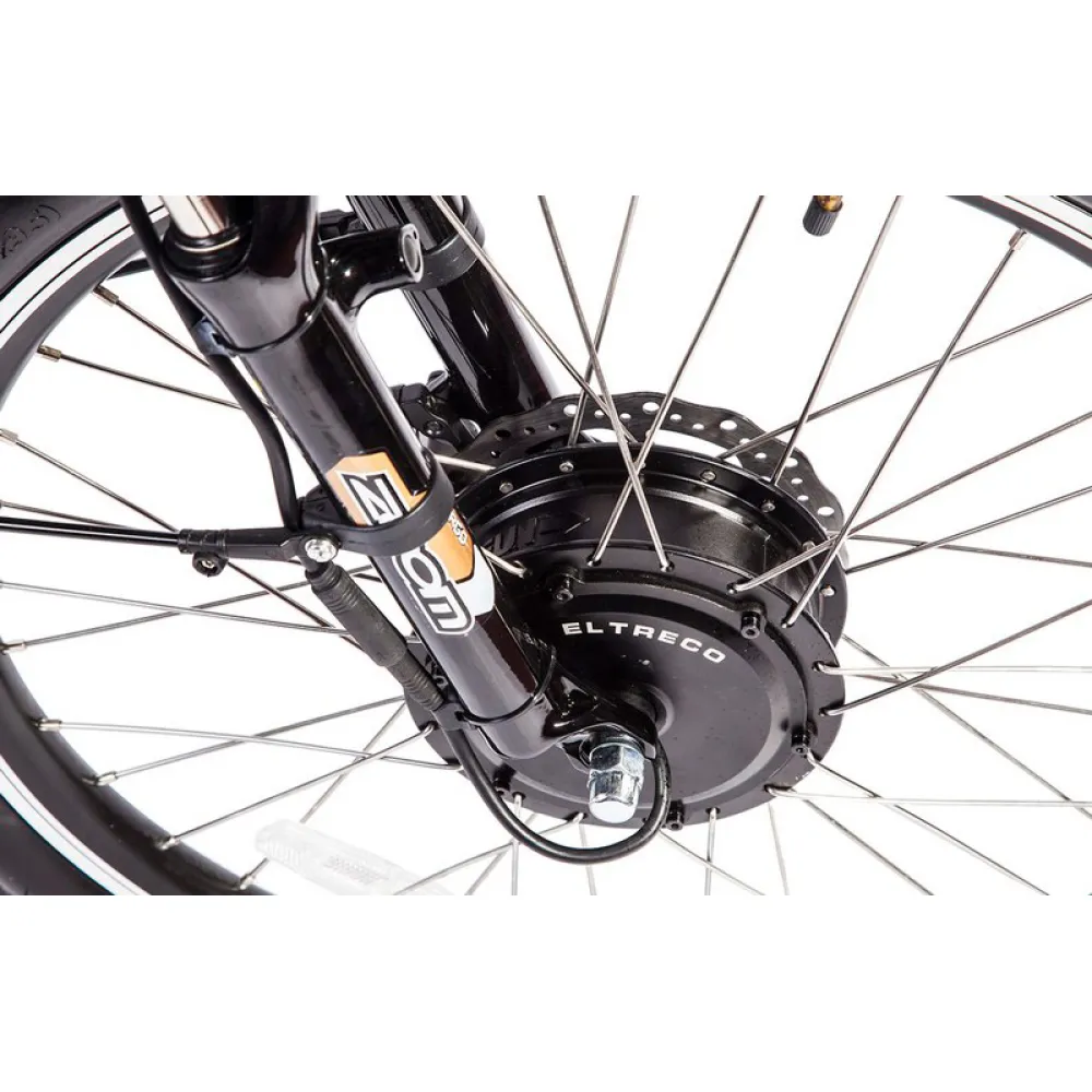 Компания Eltreco всегда заботится о потребителе, и стремится улучшить модели в соответствии с их пожеланиями. Поэтому велогибид оснащен облегченным двигателем производства компании Bafang мощностью 350Вт.