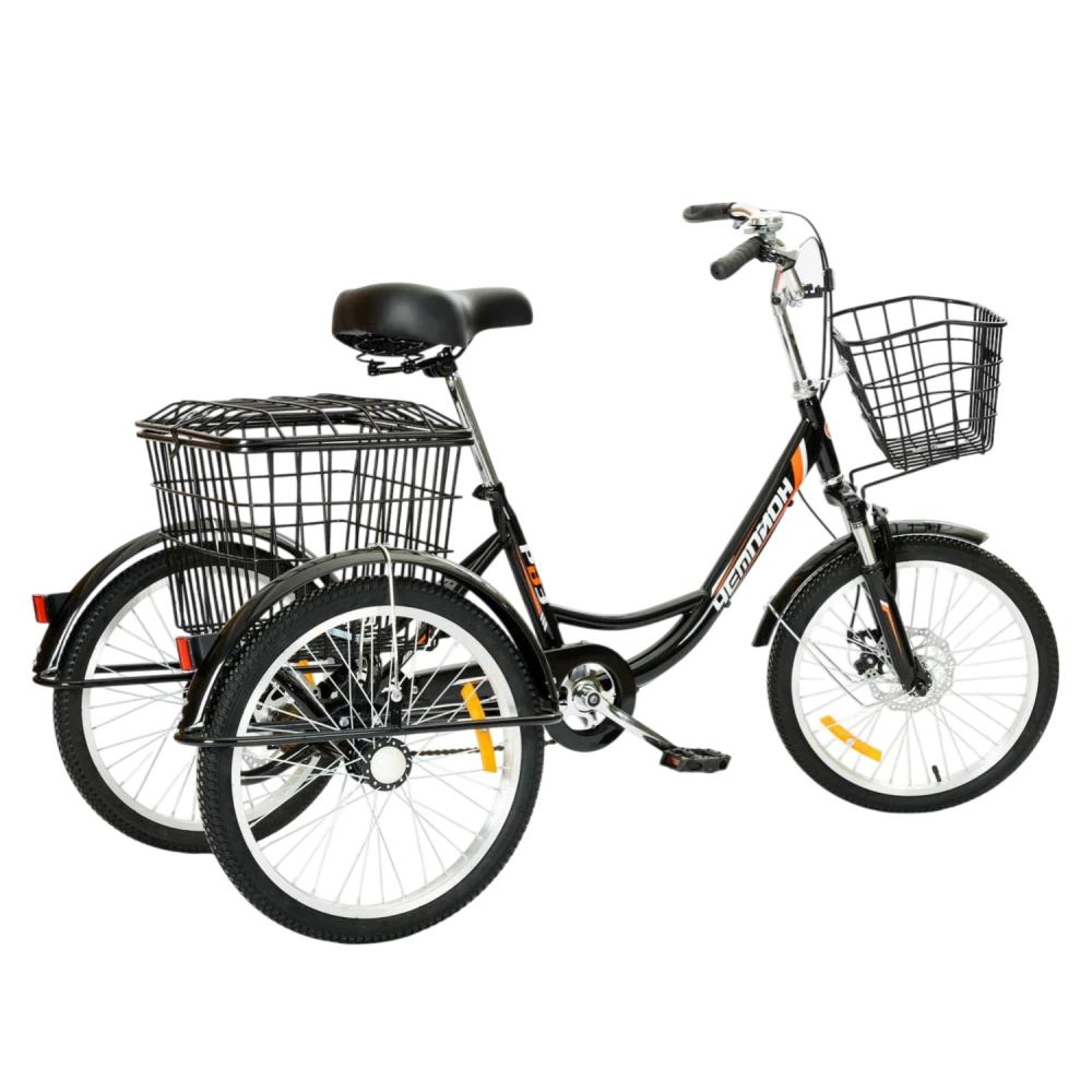 Велосипед РВЗ Чемпион 20 — надёжный трёхколёсный вариант для взрослых с устойчивостью и удобством хранения. Он идеален для повседневных поездок и перевозки грузов благодаря корзинам и нагрузке до 170 кг.